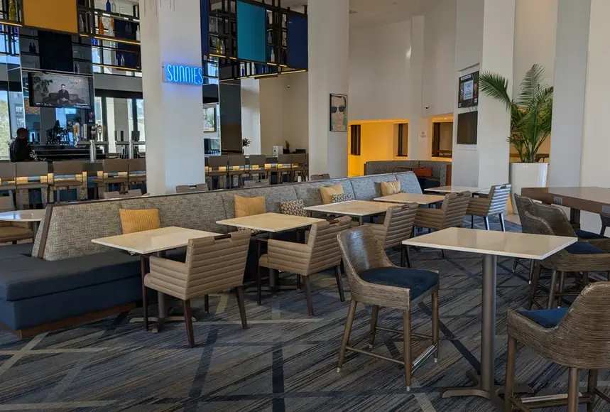 The lobby bar, Sunnies, was open from 4 to 11 p.m. and served drinks and bites, including chicken wings, sliders, and salads.